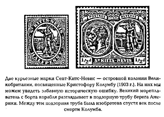 Вот при приближении к земле Колумб в окружении моряков рассматривает берег с борта корабля. Он подтянут и чисто выбрит. Зато на другой марке, спустившись с того же корабля в шлюпку, Колумб изображен заросшим густой бородой. За полчаса, разделявшие эти два события, в облике великого мореплавателя произошла удивительная перемена. Внимательный человек заметит схожие метаморфозы, происходившие с Колумбом, буквально на всех марках серии. Впрочем, будем снисходительны. Филателисты в течение 113 лет имели возможность подробно обсуждать смешные детали только потому, что почта допустила ошибки.