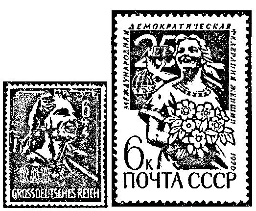 Слева — марка Германии с изображением немецкой женщины — члена военизированного трудового корпуса. 1944 г. Справа — марка СССР, посвященная 25-летию Демократической федерации жен щин. 1970 г. страны (неважно, на что он направлен — на мирное развитие или на будущую кровавую войну). Мужчина должен изображаться мужественным воином, стара тельным работником. Образ женщины на полотнах официальной живописи, на плакатах и марках обязан воплощать социальный оптимизм, радостное восприятие действительности.