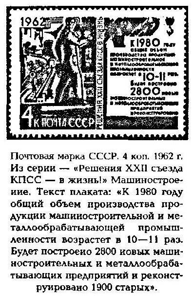 В том же ключе исполнены и остальные восемь марок серии: плакатные фигуры людей на фоне индустриальных и сельскохозяйственных пейзажей и тексты, тексты, тексты... Трудно представить, что кто-то из тех, кто утверждал марки к выпуску, верил, будто от правители писем, вооружившись лупами, станут читать контрольные цифры семилетнего плана, принято-